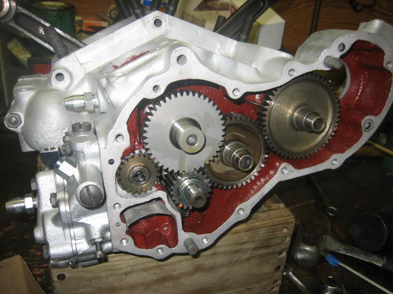 The flywheels were dynamically balanced on a Sunnen machine and trued on an HD truing stand to less then .001 runout and recieved a 1954-57 pinion shaft with custom ground bearing cages to significantly increase bearing surface area and strengthen up the bottom end. The gearcase features an Andrews "S" grind cam, S&S pinion gear properly sized to the new cam along with new gear studs and bushings for the idler and circuit breaker gears. The gearcase cover recieved new bushings as well as the right case recieving a new cam bushing and everything was line reamed to size and true everything up.