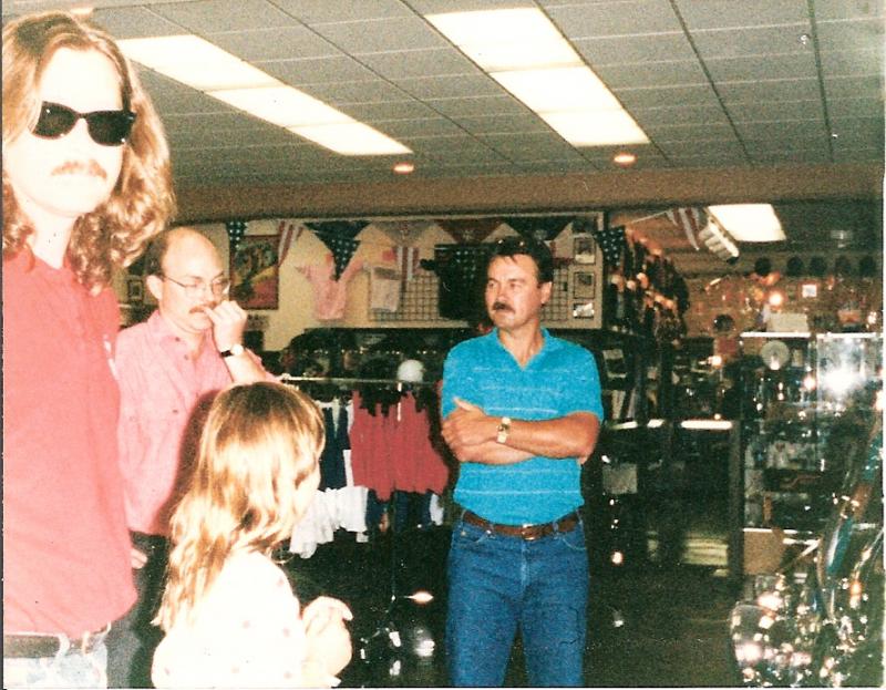 This photo was taken along our summer of 1991 cross- country trip at Dudley Perkins' HD dealership in San Francisco, CA. Shown here is my father Joe and his cousin Joe to the far left. Their mothers were sisters and if my father had long hair in this picture they could be twins!